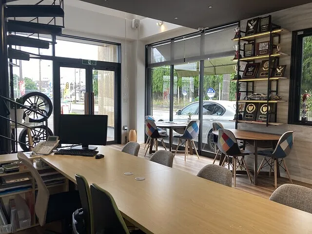 当店は国に認められた指定工場。だから車検・修理に必要な最新設備が揃っているんです。また時間を気にせずご相談いただける商談スペースや、車検・修理中もゆっくりとお過ごしいただける待合スペースを完備しております。