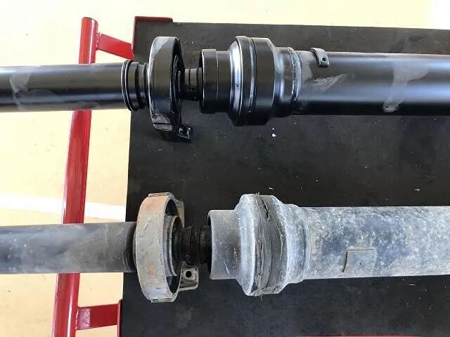 本日は、走行中に異音がする、とのご依頼を頂きました。早速、走行テストをしてみると、確かに30㌔辺りから唸り音がすごいです。リフトアップにて、点検してみると、リヤプロペラシャフトのセンタージョイント及びセンターベアリングからの異音ですね~。プロペラシャフトAssy交換後、試乗し異音も無く修理完了です。またのご来店をお待ちしております。